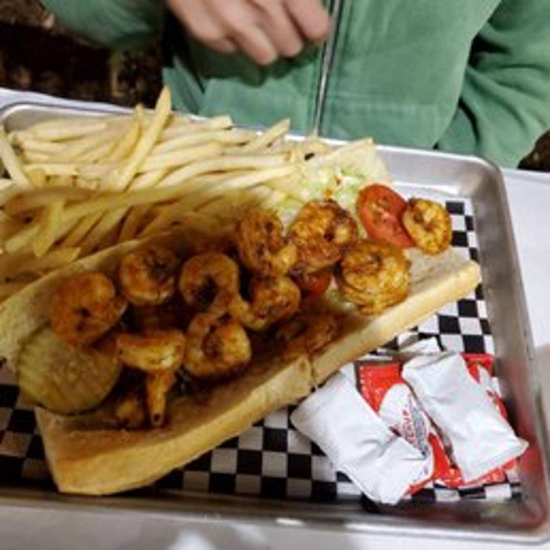 A classic New Orleans sandwich featuring crispy fried shrimp, shredded lettuce, ripe tomatoes, pickles, and zesty remoulade sauce, all served on toasted French bread.
