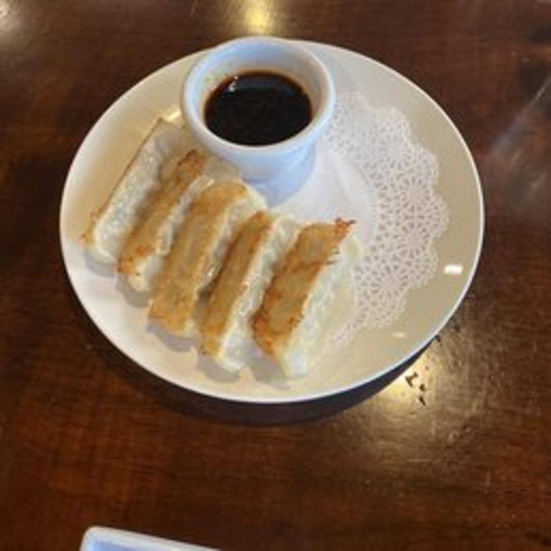 Pan-fried Japanese dumplings, typically filled with ground pork and vegetables, served with a dipping sauce.
