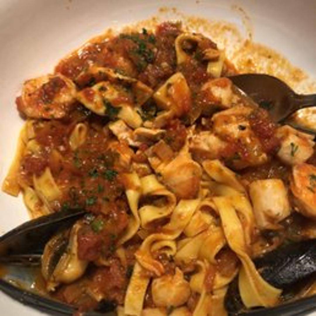 A generous selection of fresh seafood, including shrimp, mussels, clams, and calamari, simmered in a flavorful broth.