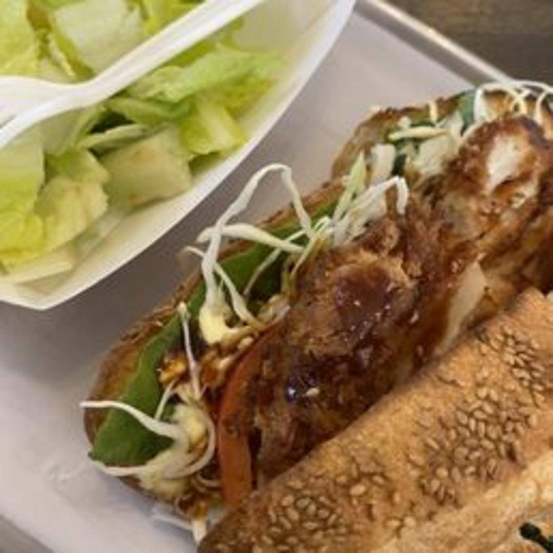 Crispy, breaded chicken cutlet (katsu) served on soft, toasted bread. Often includes shredded cabbage, tonkatsu sauce, and mayonnaise.