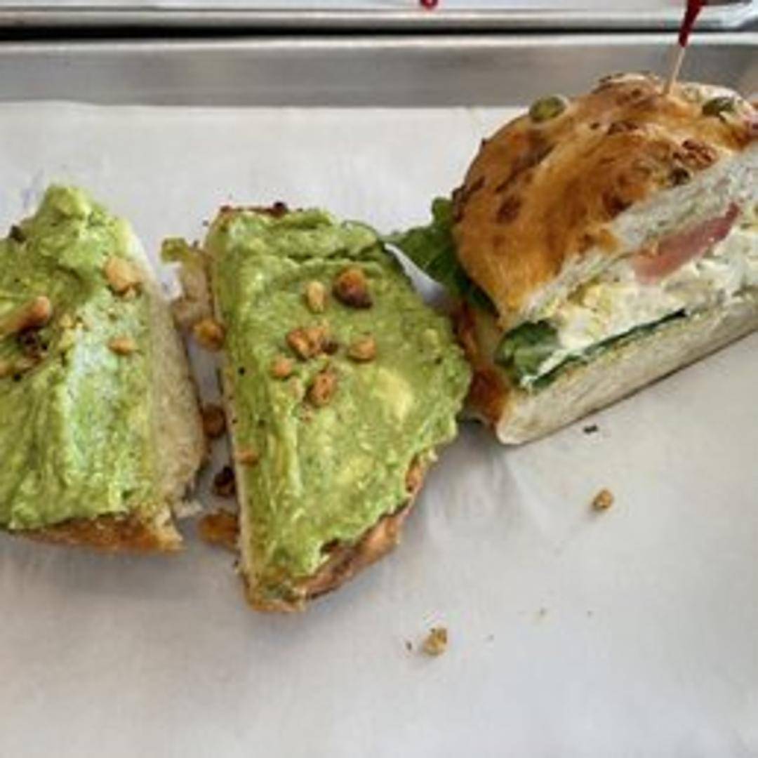 Classic egg salad made with chopped hard-boiled eggs, mayonnaise, and seasonings, served on soft bread. May contain lettuce or other garnishes.