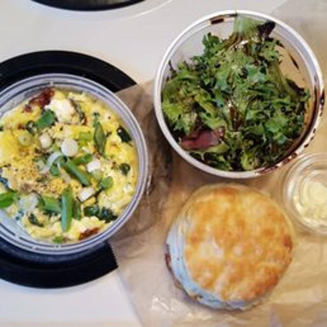 Start your day with our vibrant Spinach and Goat Cheese Scramble. Fluffy eggs are lightly scrambled with fresh, tender spinach leaves and crumbled goat cheese, which melts to create pockets of creamy, tangy goodness. A delightful and wholesome option, rich in flavor and light in texture.