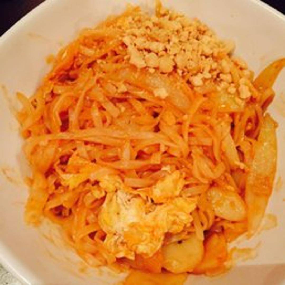 An iconic and flavorful Thai stir-fried noodle dish, featuring tender rice noodles wok-tossed with a harmonious blend of sweet, sour, and savory tamarind sauce, fresh bean sprouts, crunchy peanuts, scrambled egg, and your choice of protein like shrimp or chicken.