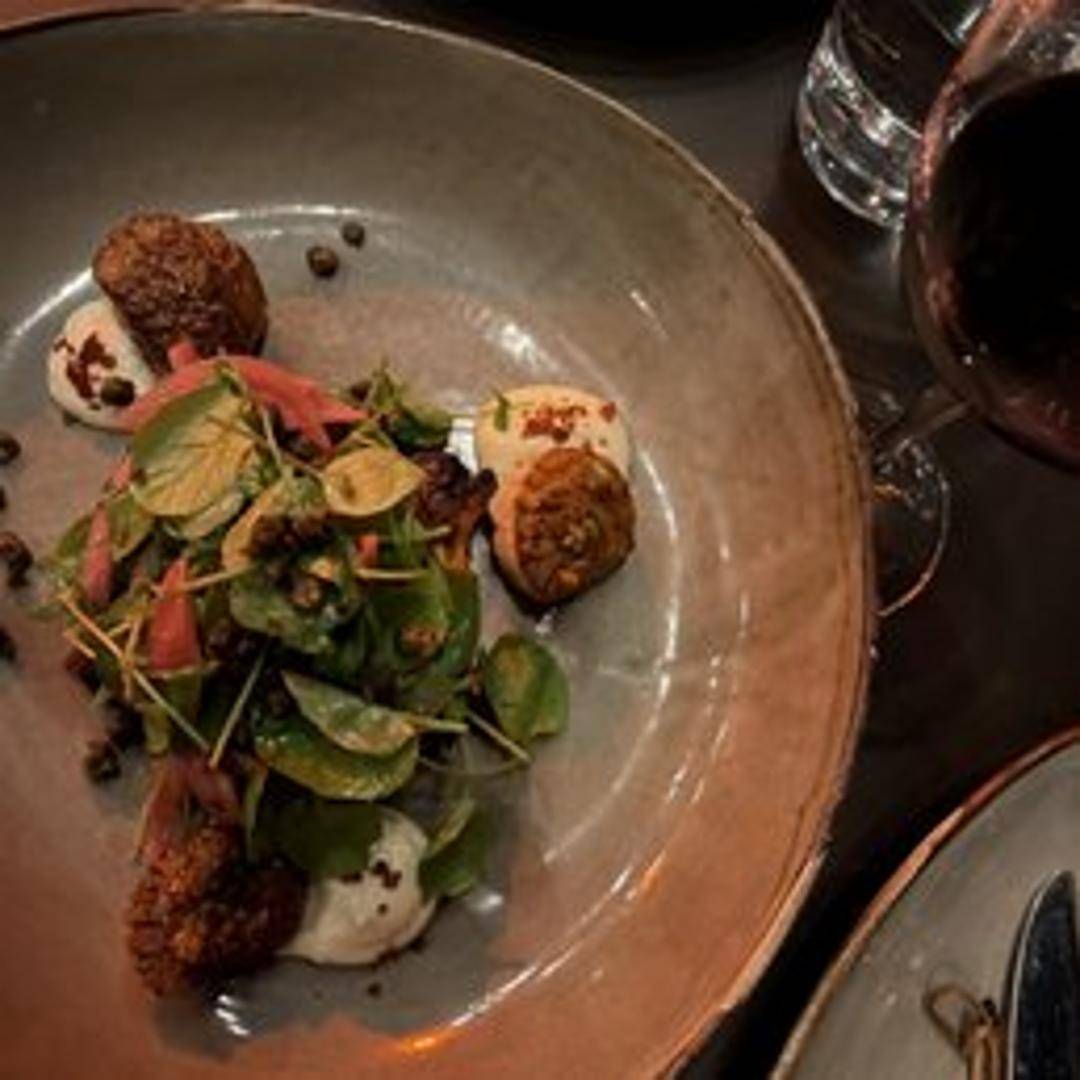 Pan-seared diver scallops, served with a seasonal vegetable accompaniment and a delicate sauce or reduction. Fresh and flavorful.