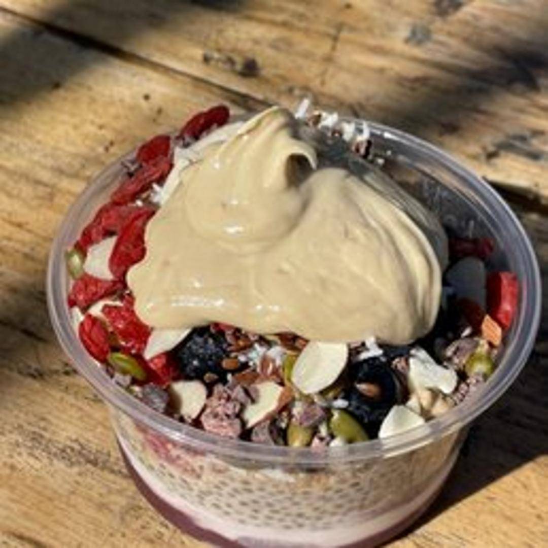 A blended base of acai berries topped with a variety of fresh fruits, granola, and other superfood ingredients. Typically includes banana, berries (such as strawberries, blueberries, and raspberries), and granola for texture and sweetness. May also feature ingredients like coconut flakes, chia seeds, honey, almond butter, or goji berries. The exact ingredients may vary, so inquire within for specific details and customizations.