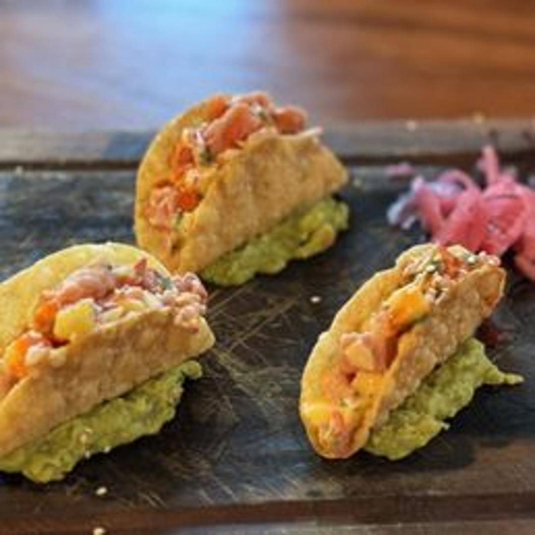Two crispy wonton shell tacos filled with sushi-grade Ahi tuna, seared rare and diced. Tossed with a vibrant sesame-ginger dressing, shredded cabbage, sliced avocado, and a drizzle of spicy sriracha aioli. Topped with toasted sesame seeds and green onions. These tacos offer a delicious fusion of Mexican and Asian flavors.