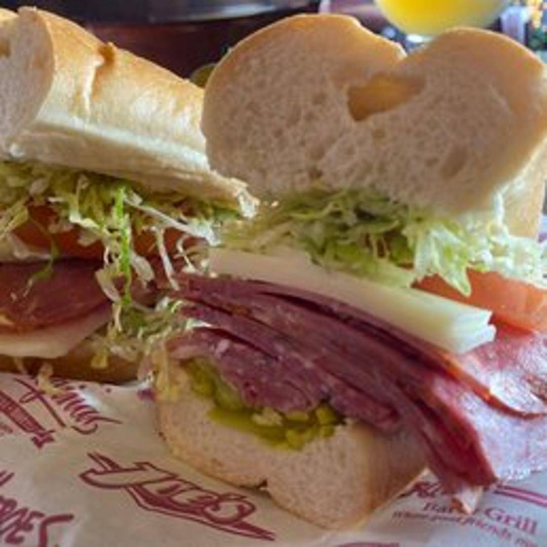 Genoa salami, capicola, mortadella, provolone cheese, lettuce, tomato, onions, and Italian dressing on a crusty Italian roll.