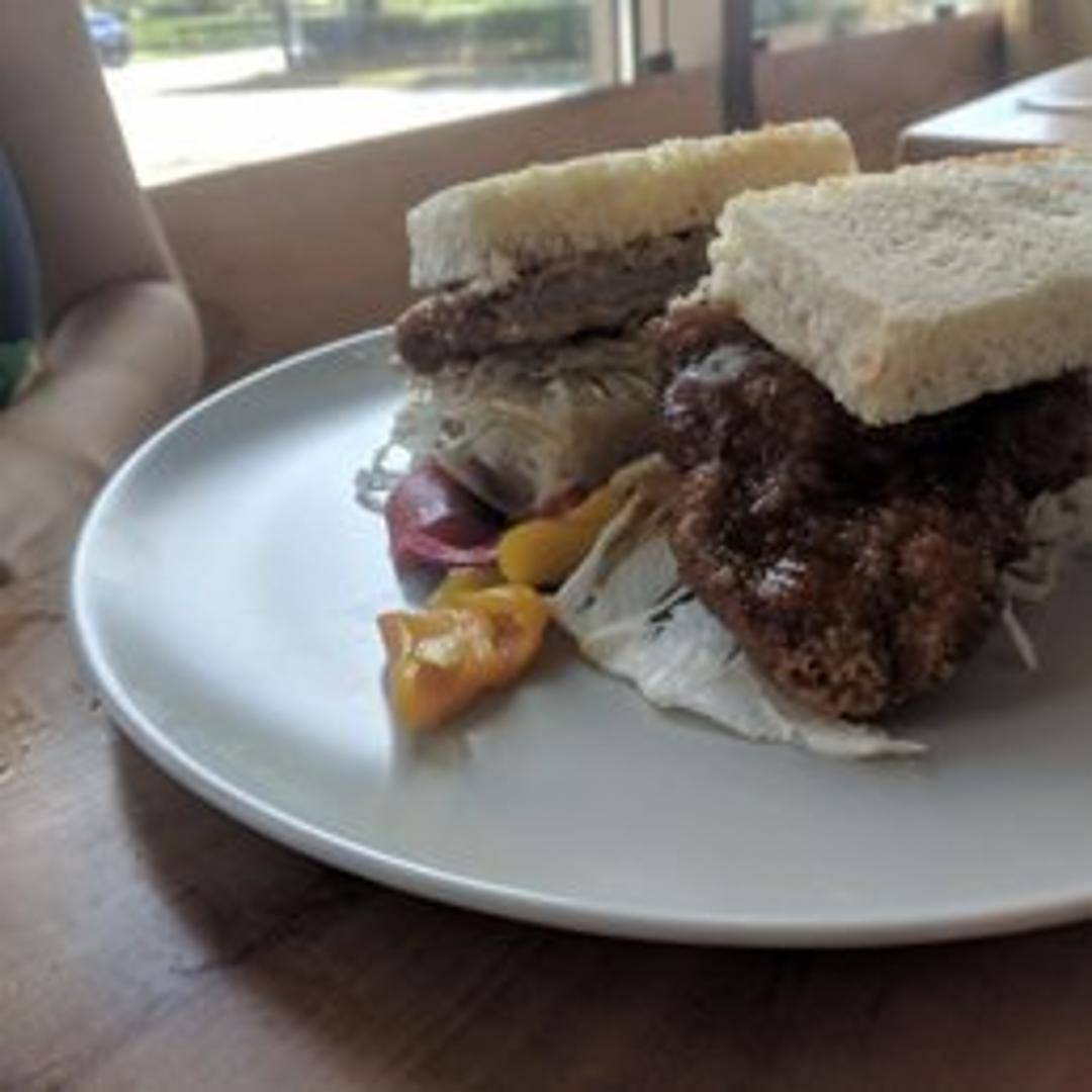 Indulge in Rose's take on the satisfying Katsu Sandwich. Featuring a perfectly golden-fried, crispy, and tender cutlet, expertly nestled between slices of soft, lightly toasted milk bread with crisp shredded cabbage and a drizzle of tangy, savory Katsu sauce. A delightful and hearty hand-held meal.