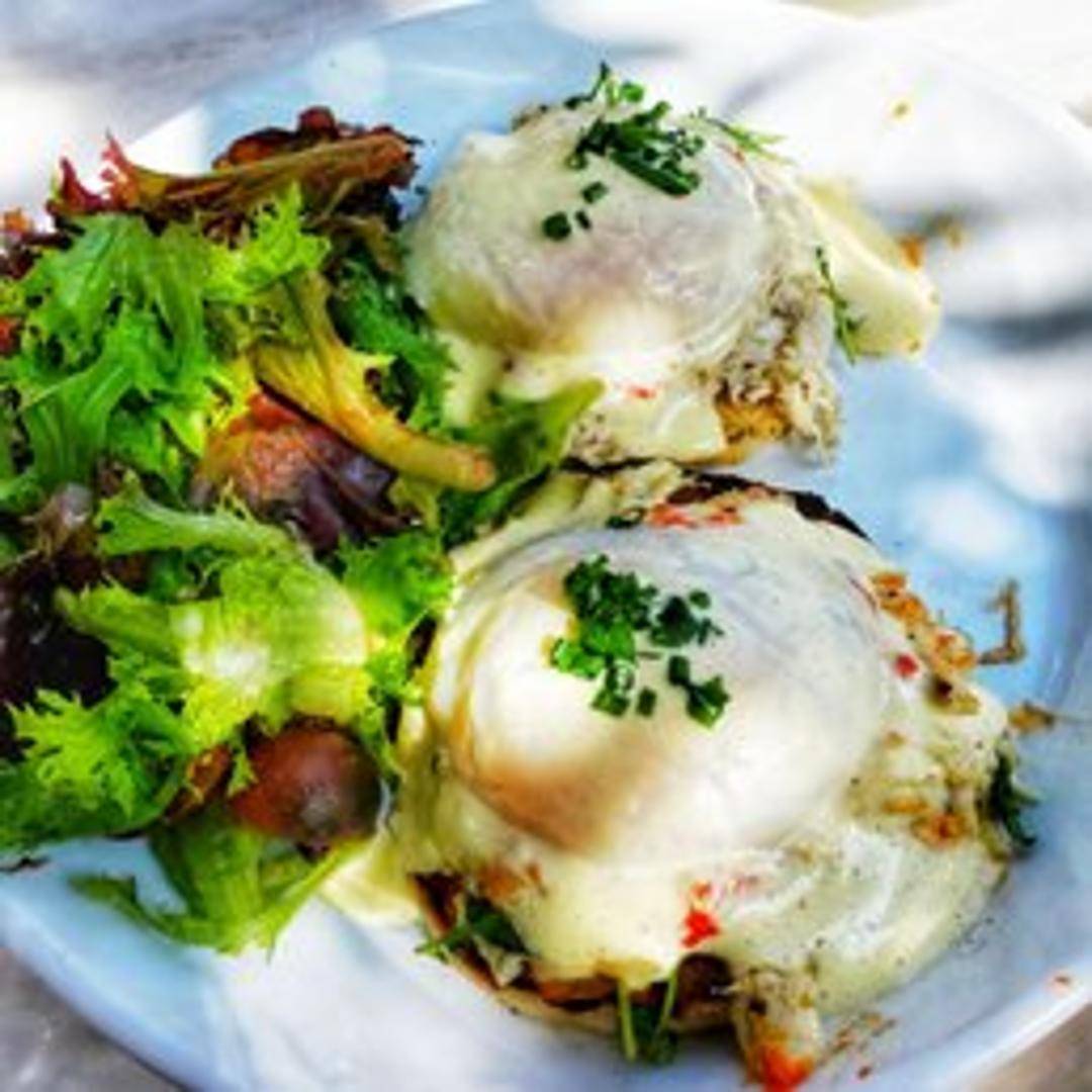 A classic brunch indulgence: two perfectly poached eggs, layered atop slices of savory Canadian bacon and toasted English muffins, all generously draped with a velvety, rich hollandaise sauce. A truly luxurious start to your day.