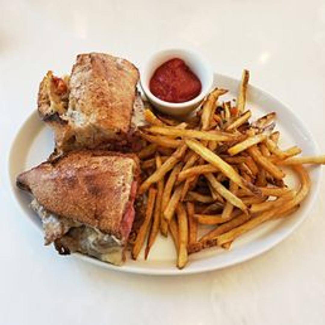 A gourmet rendition of the classic cheesesteak, featuring thinly sliced, tender rotisserie-roasted ribeye steak, perfectly melted artisanal cheese, and sweet caramelized onions, all nestled within a toasted, crusty baguette. Served with a side of crispy seasoned fries.