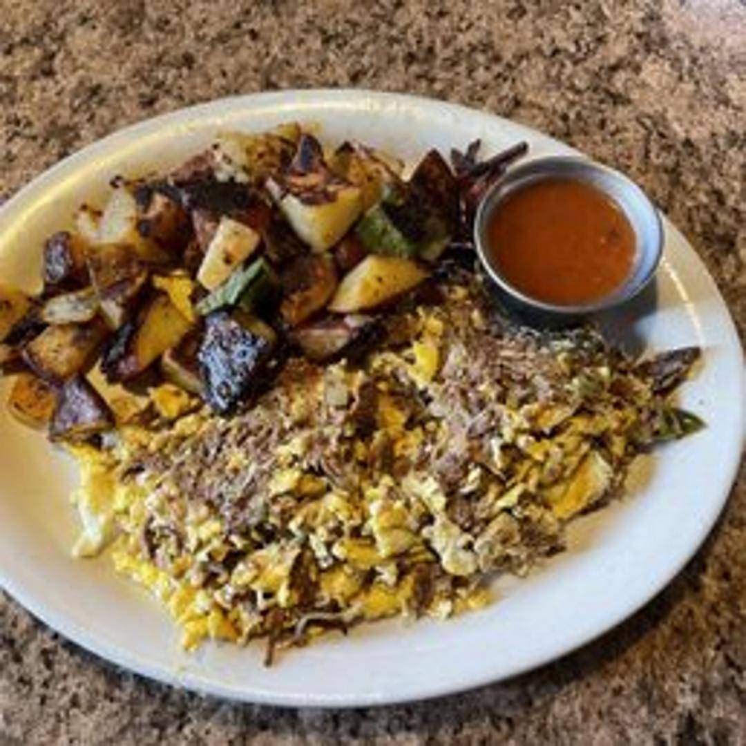Shredded, seasoned beef scrambled with eggs, onions, and peppers. Served with tortillas, rice, and beans.