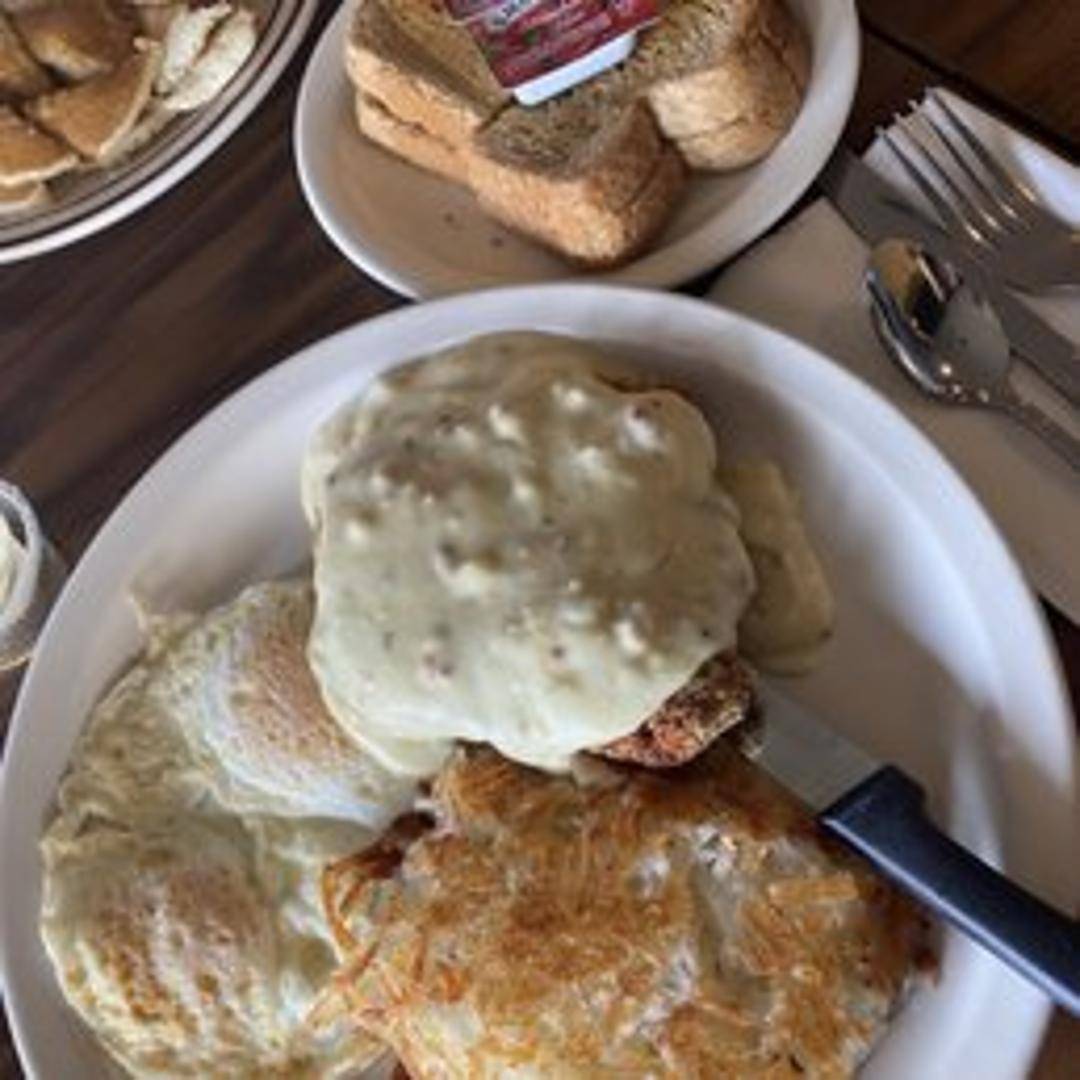 Tender steak, breaded and fried to a golden brown, smothered in creamy country gravy. Served with mashed potatoes and a vegetable.