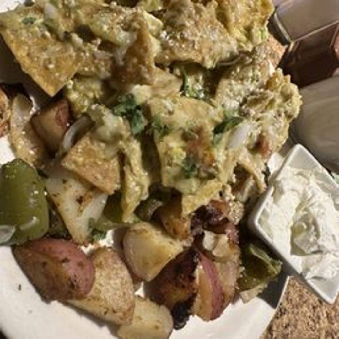 Crispy tortilla chips simmered in your choice of red or green salsa, topped with cheese, onions, and sour cream. Served with eggs and your choice of meat.