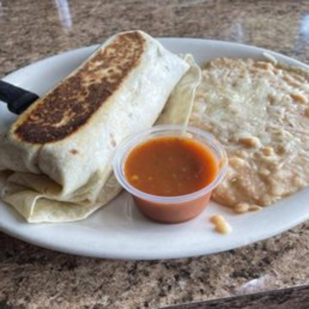 A large flour tortilla filled with scrambled eggs, cheese, your choice of bacon, sausage, or chorizo, and potatoes. Served with salsa.