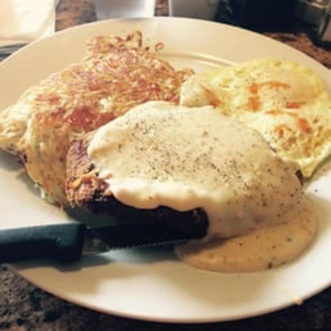 Tender steak, breaded and fried to a golden brown, smothered in creamy country gravy. Served with mashed potatoes and a vegetable.