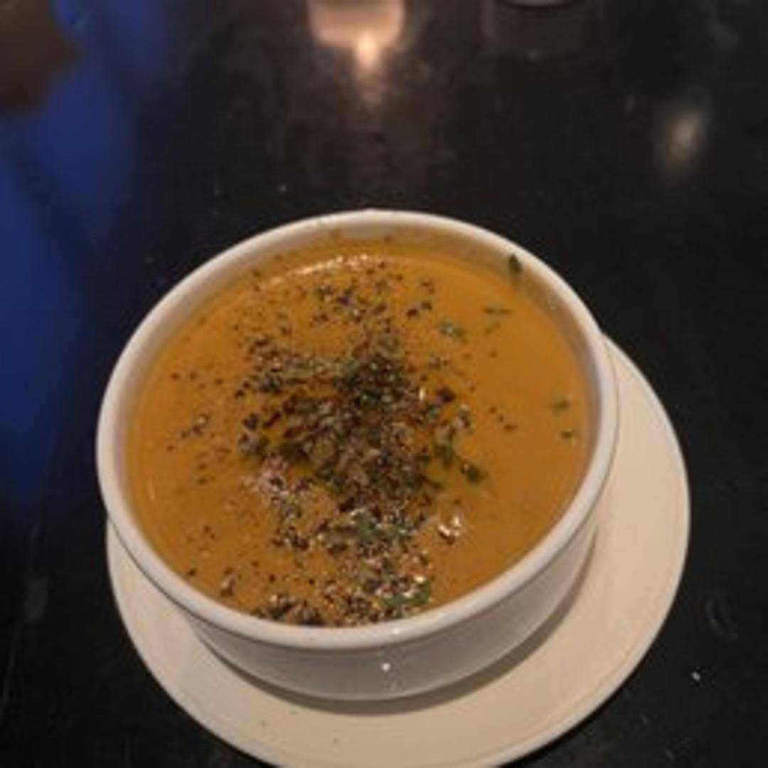 A rich and creamy soup featuring succulent lobster meat. Garnished with a swirl of cream and fresh chives.
