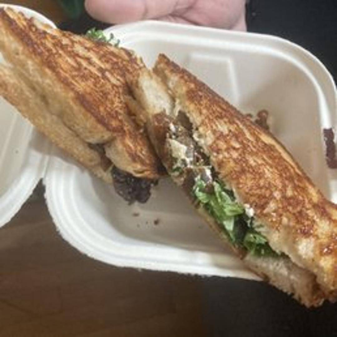 Grilled sourdough bread filled with house-made vegan cheese sauce, caramelized onions, roasted red peppers, and balsamic glaze.