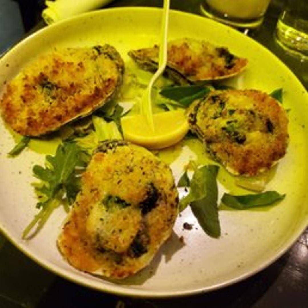 A classic, decadent appetizer featuring fresh oysters on the half shell, baked to perfection under a rich, savory topping typically made with butter, finely chopped herbs (like parsley and spinach), and breadcrumbs, often with a hint of anise-flavored liqueur, resulting in a golden, bubbling finish.