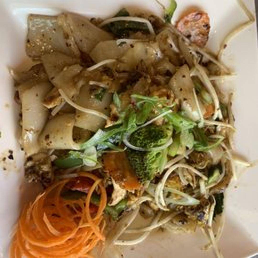 Stir-fried wide rice noodles with chicken, beef, or tofu (specify protein choice), basil, onions, bell peppers, and chili in a savory and spicy sauce.