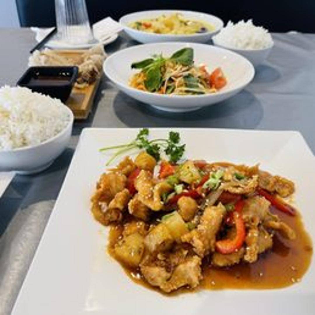 Crispy, bite-sized chicken pieces coated in a sweet, tangy, and slightly spicy General Thai sauce. Served with steamed rice.