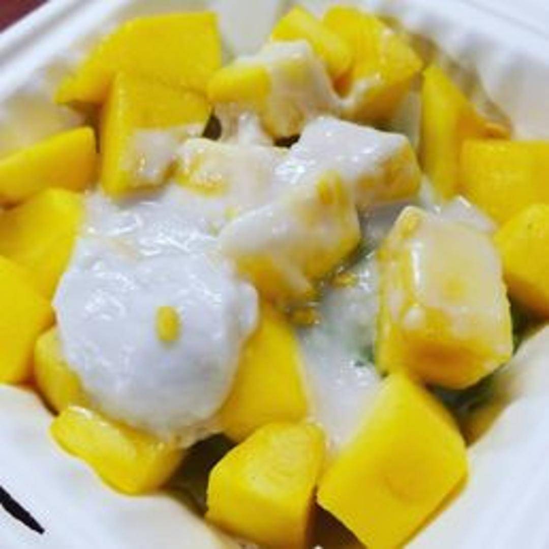 A beloved traditional Thai dessert, featuring perfectly ripe slices of fresh mango served alongside warm, sweet sticky rice. Drizzled generously with a rich, creamy coconut milk sauce, this iconic dish offers a delightful harmony of sweet, soft, and slightly savory textures.
