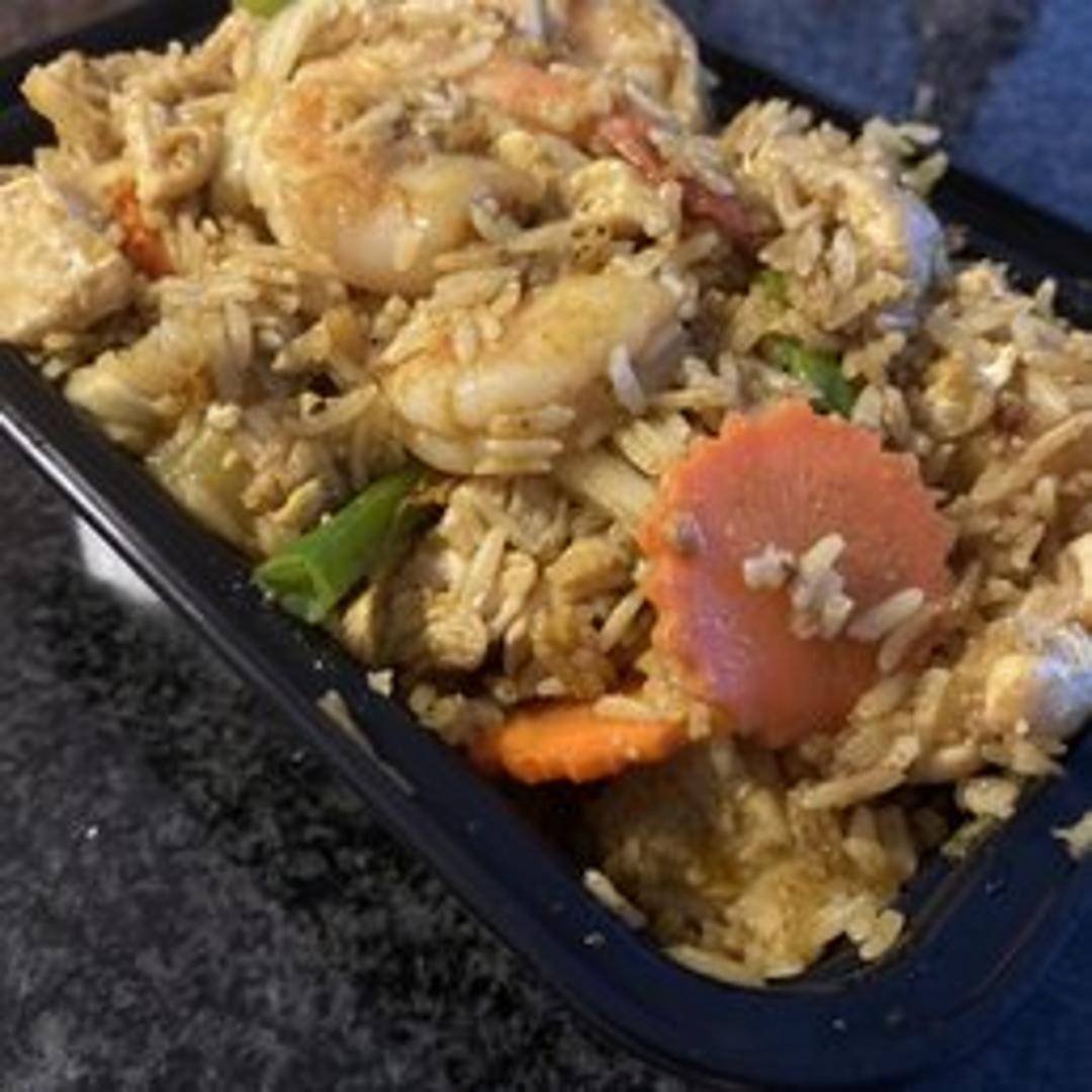 A delightful and aromatic fried rice dish, featuring jasmine rice stir-fried with juicy chunks of fresh pineapple, cashews, raisins, tender chicken or shrimp (or tofu for vegetarian option), and a hint of curry powder, often served in a carved pineapple shell. This vibrant dish offers a perfect balance of sweet and savory flavors.