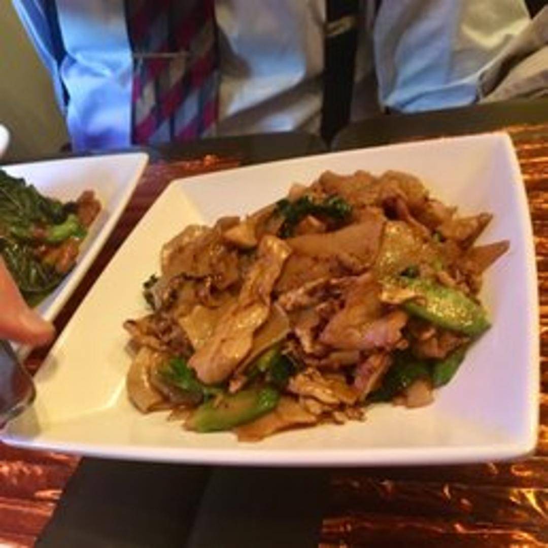 A beloved Thai noodle dish, 'Pad See Ew' consists of wide, flat rice noodles stir-fried with your choice of protein (chicken, beef, pork, or tofu), Chinese broccoli, and egg, all tossed in a savory dark soy sauce. The noodles are slightly charred for a smoky flavor, creating a comforting and highly satisfying meal.