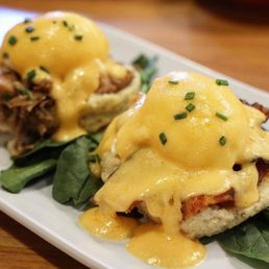 A Southern-inspired twist on a brunch favorite, this dish features two perfectly poached eggs nestled atop tender, slow-cooked cochon (pulled pork), all resting on a toasted buttermilk biscuit. It's generously drizzled with a rich and creamy Hollandaise sauce, offering a harmonious blend of smoky, savory, and tangy notes, creating a truly decadent breakfast experience.