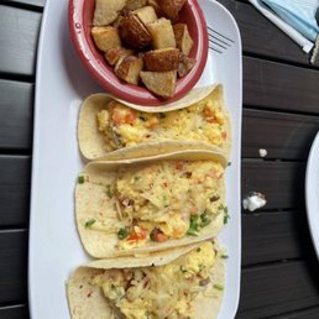 A delightful morning classic featuring warm flour tortillas generously filled with scrambled eggs, seasoned breakfast potatoes, a blend of melted cheeses, and your choice of savory breakfast meats or fresh vegetables. Served with a side of house-made salsa and a dollop of sour cream, these tacos offer a perfect fusion of flavors and textures to kickstart your day.