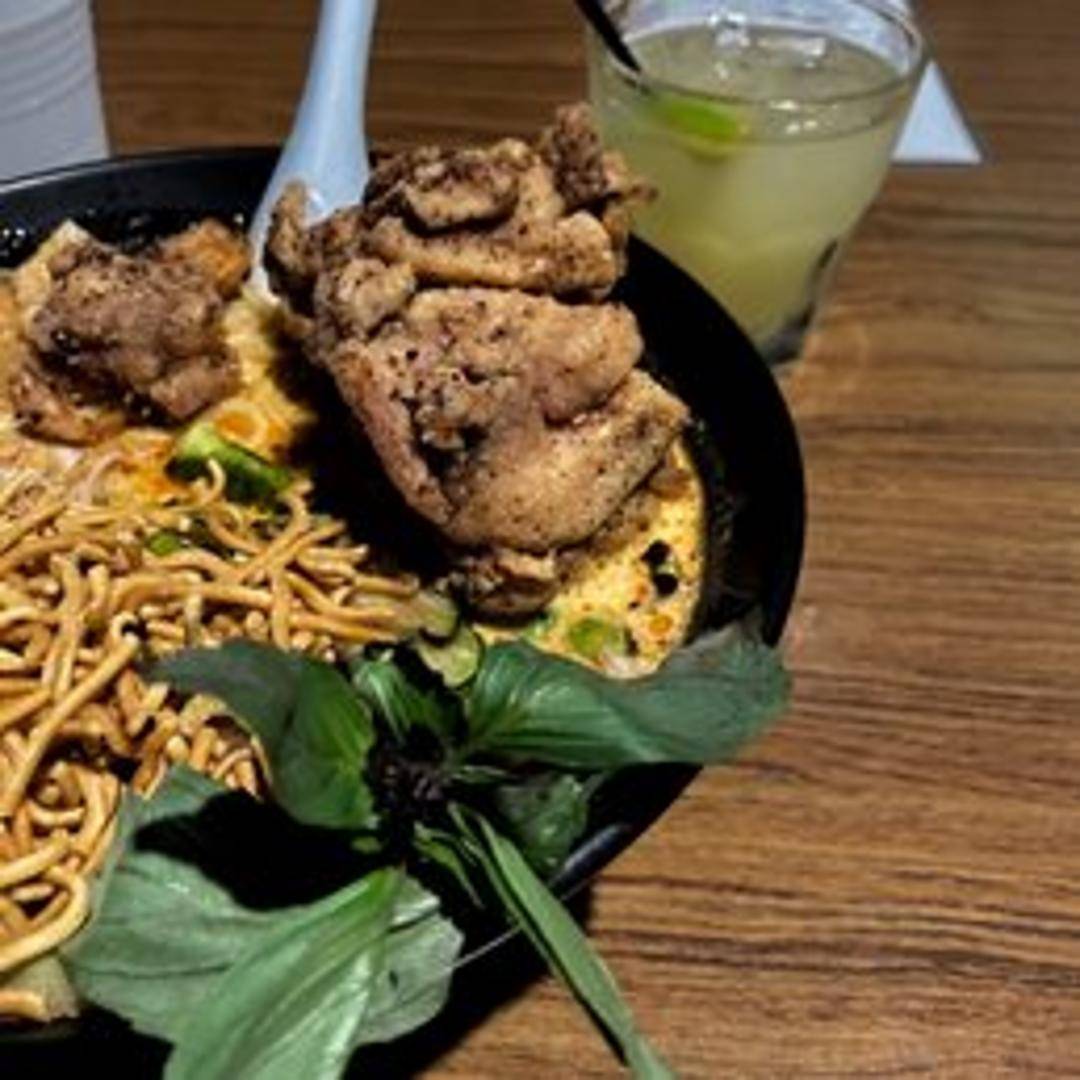 A flavorful vegan ramen featuring a rich and spicy green curry broth. Loaded with vegetables and noodles.