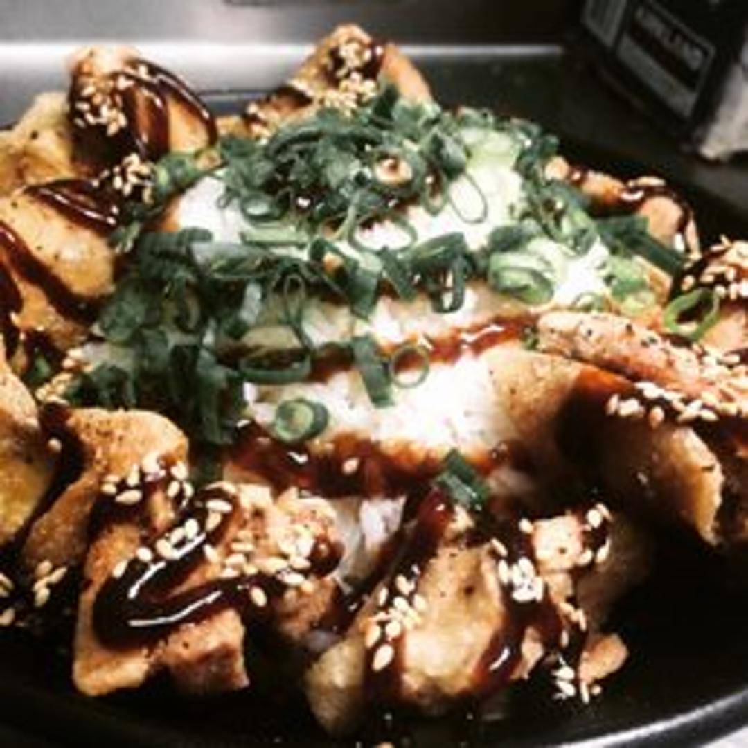 A satisfying rice bowl featuring crispy fried chicken. Served over rice and complemented by a flavorful sauce and toppings like pickled vegetables.