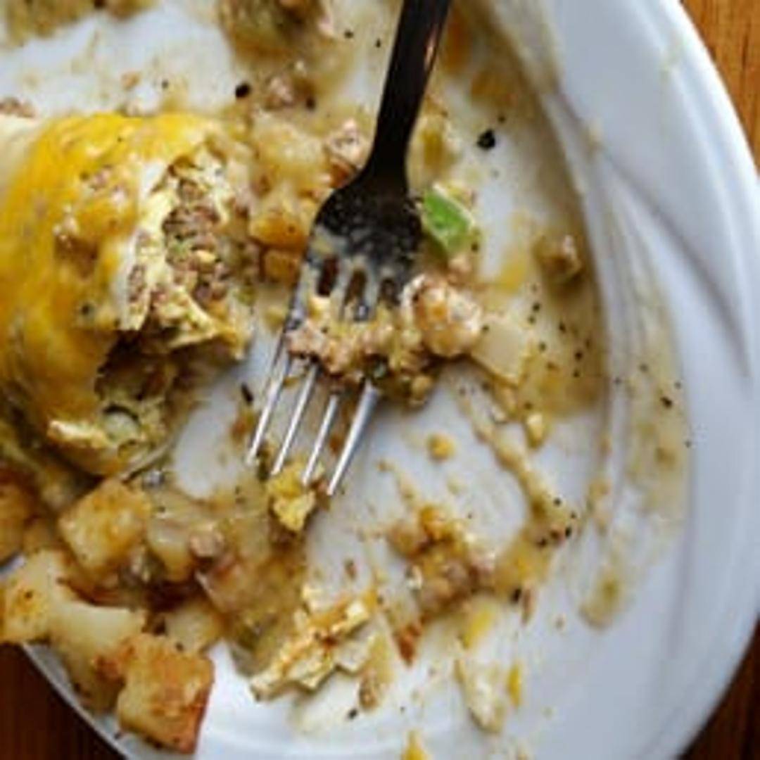 A hearty burrito filled with scrambled eggs, potatoes, cheese, and your choice of meat (bacon, sausage, chorizo, or veggie). Smothered in your choice of green chili or gravy.