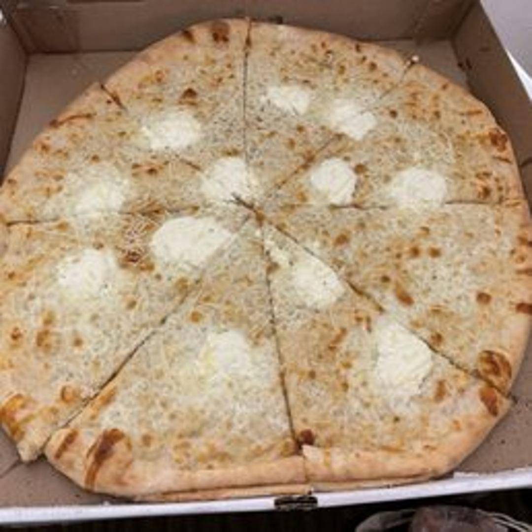 A whole pizza featuring a creamy white sauce base and a blend of four cheeses including mozzarella, provolone, parmesan, and ricotta, baked to bubbly perfection.