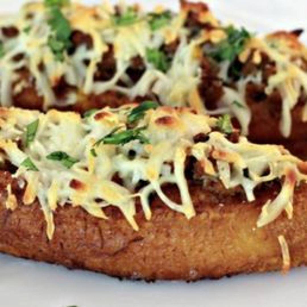 A sweet plantain, split open and filled with seasoned ground beef, then baked.