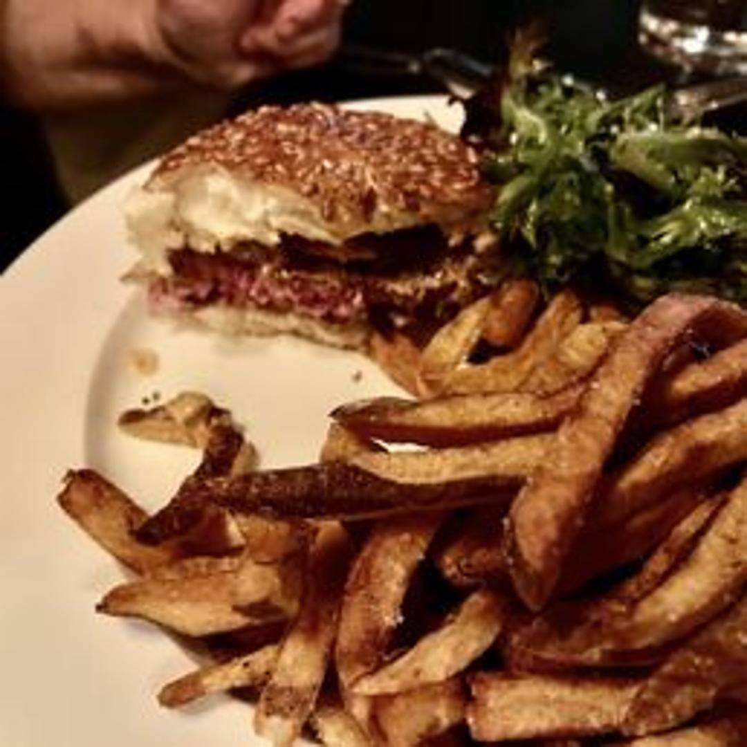 A classic burger featuring a custom-blend beef patty cooked to order. Served on a toasted brioche bun with lettuce, tomato, onion, and pickles. Accompanied by choice of cheese (such as cheddar, Swiss, or American) and a side of fries.