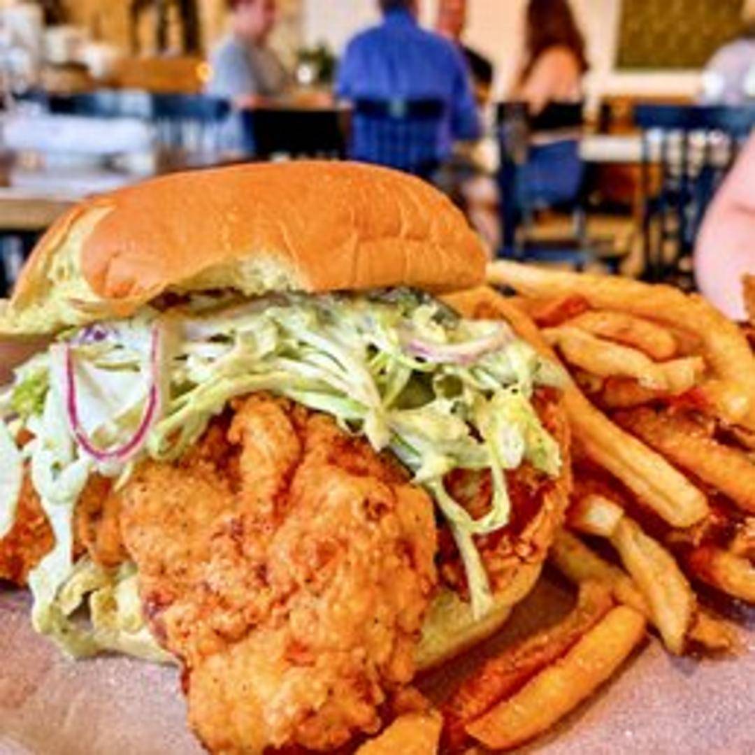 A perfectly seasoned and crispy fried chicken breast, nestled in a soft, toasted brioche bun, complemented by tangy pickles and a creamy, house-made sauce for a truly satisfying and flavorful experience.