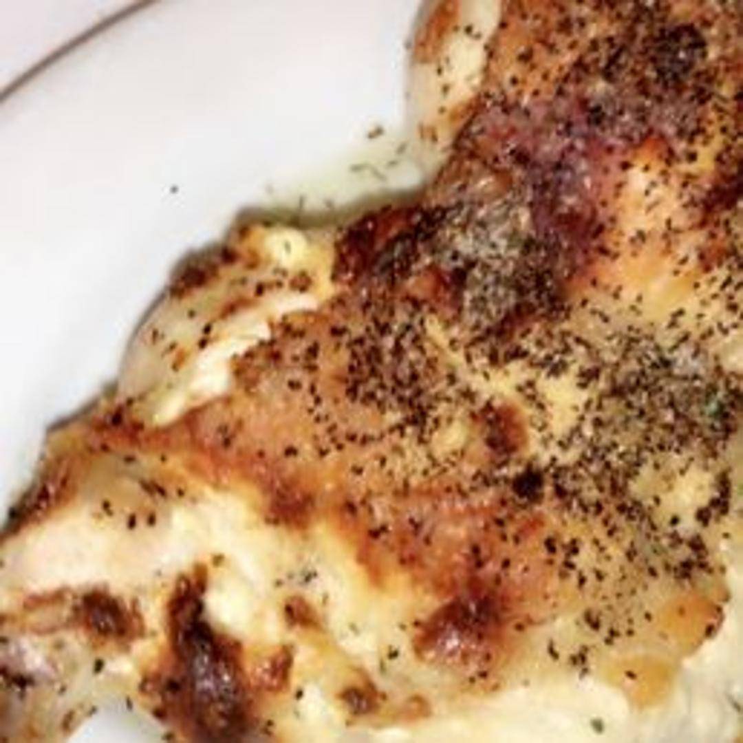 A boneless chicken breast stuffed with a creamy cheese and herb filling, oven-broiled and served golden brown.