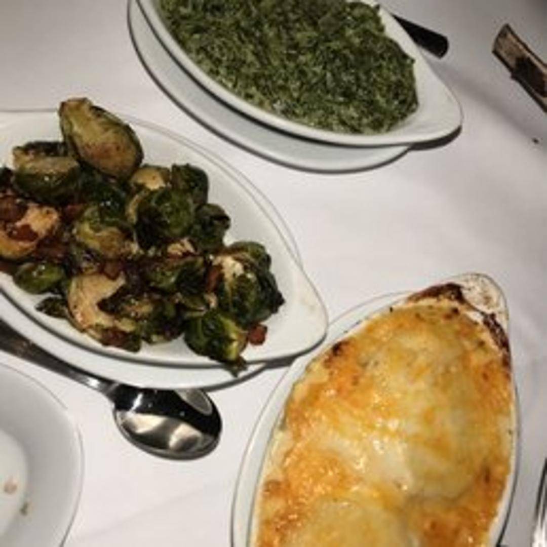 A classic steakhouse side featuring thinly sliced potatoes layered with a rich blend of three cheeses, baked until golden brown and bubbling, offering a creamy and decadent accompaniment.