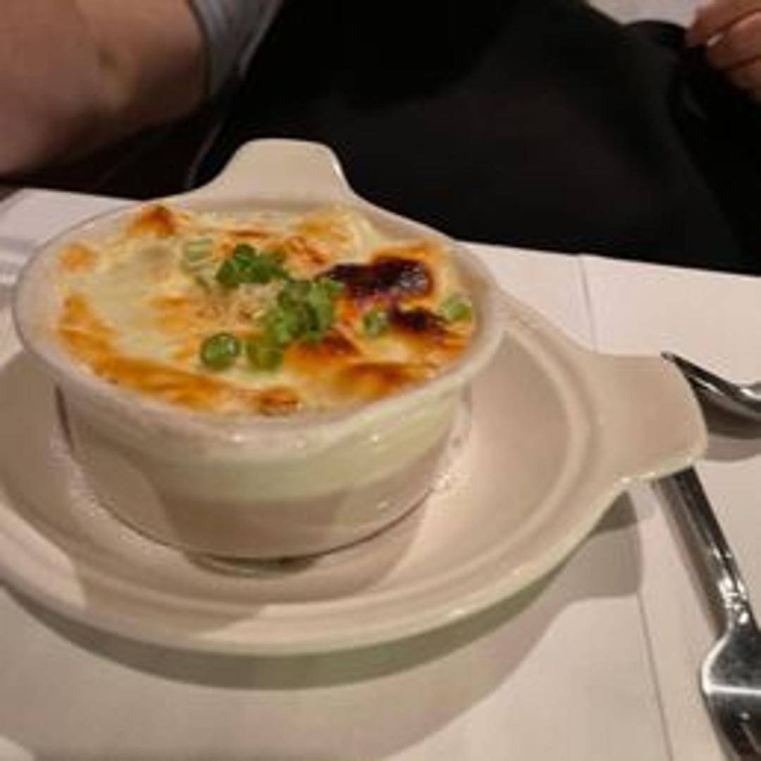 A classic French Onion Soup featuring a rich and savory beef broth, caramelized onions, and a toasted crouton, topped with melted Gruyère cheese. Served piping hot.
