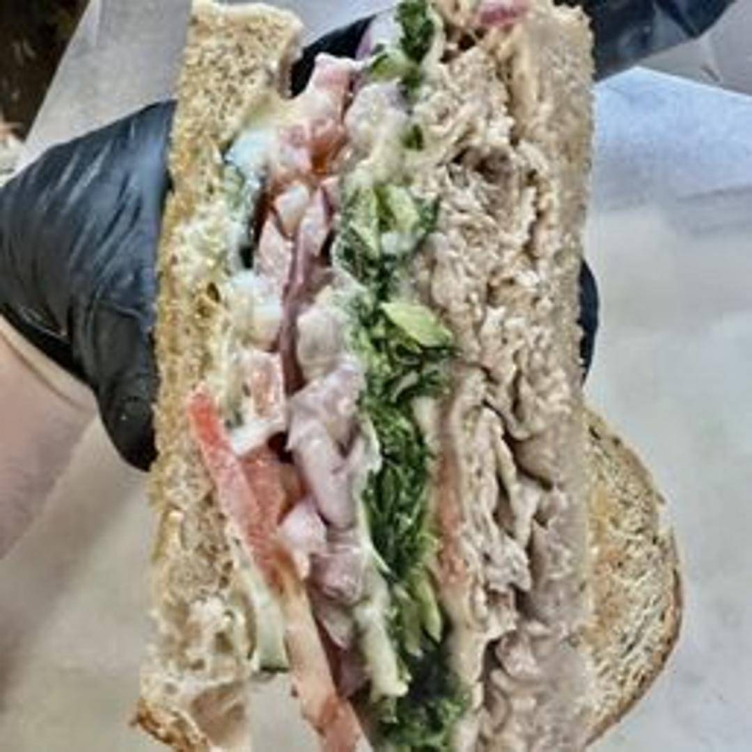 Turkey prepared and seasoned like pastrami, stacked on rye bread, typically with mustard.