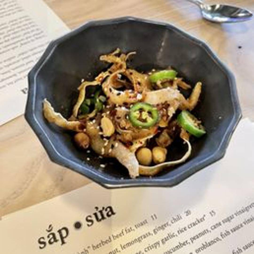 A unique salad featuring thinly sliced and crispy pigs ear, tossed with fresh greens and a vibrant dressing. The crispy texture of the ear provides a satisfying contrast to the fresh greens.