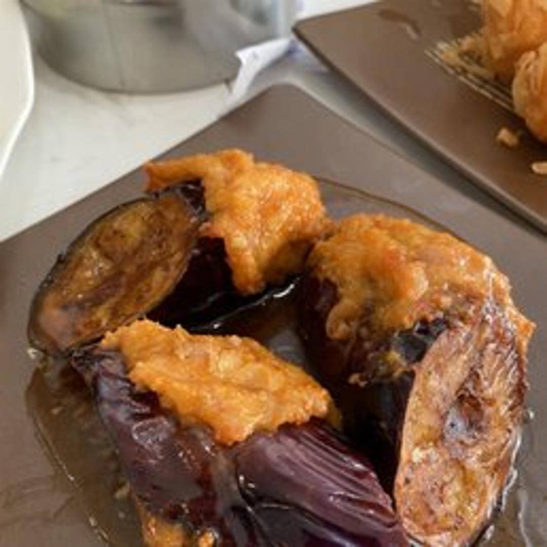 Tender slices of eggplant, lightly pan-fried or steamed, and generously stuffed with a flavorful mixture of minced shrimp and seasonings. A savory and delicate dish often drizzled with a light sauce.