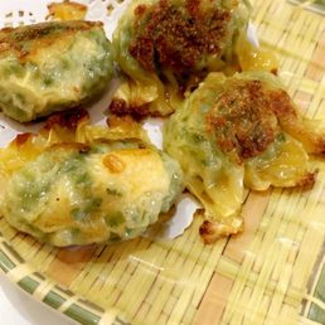 Pan-fried dumpling with a crispy golden-brown exterior, filled with a flavorful combination of fragrant chives and juicy shrimp, seasoned with soy sauce and sesame oil.