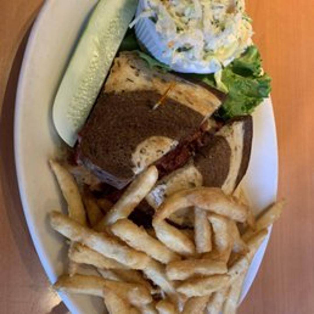 Thinly sliced corned beef piled high on grilled rye bread with Swiss cheese, sauerkraut, and Russian dressing. Served with a pickle spear.