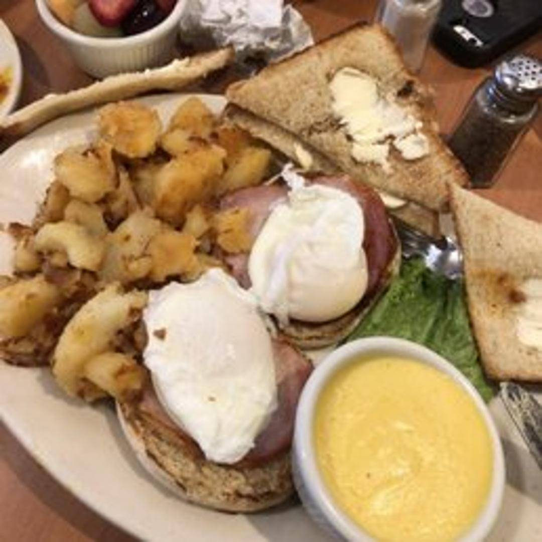Two poached eggs atop toasted English muffins with Canadian bacon, smothered in hollandaise sauce.