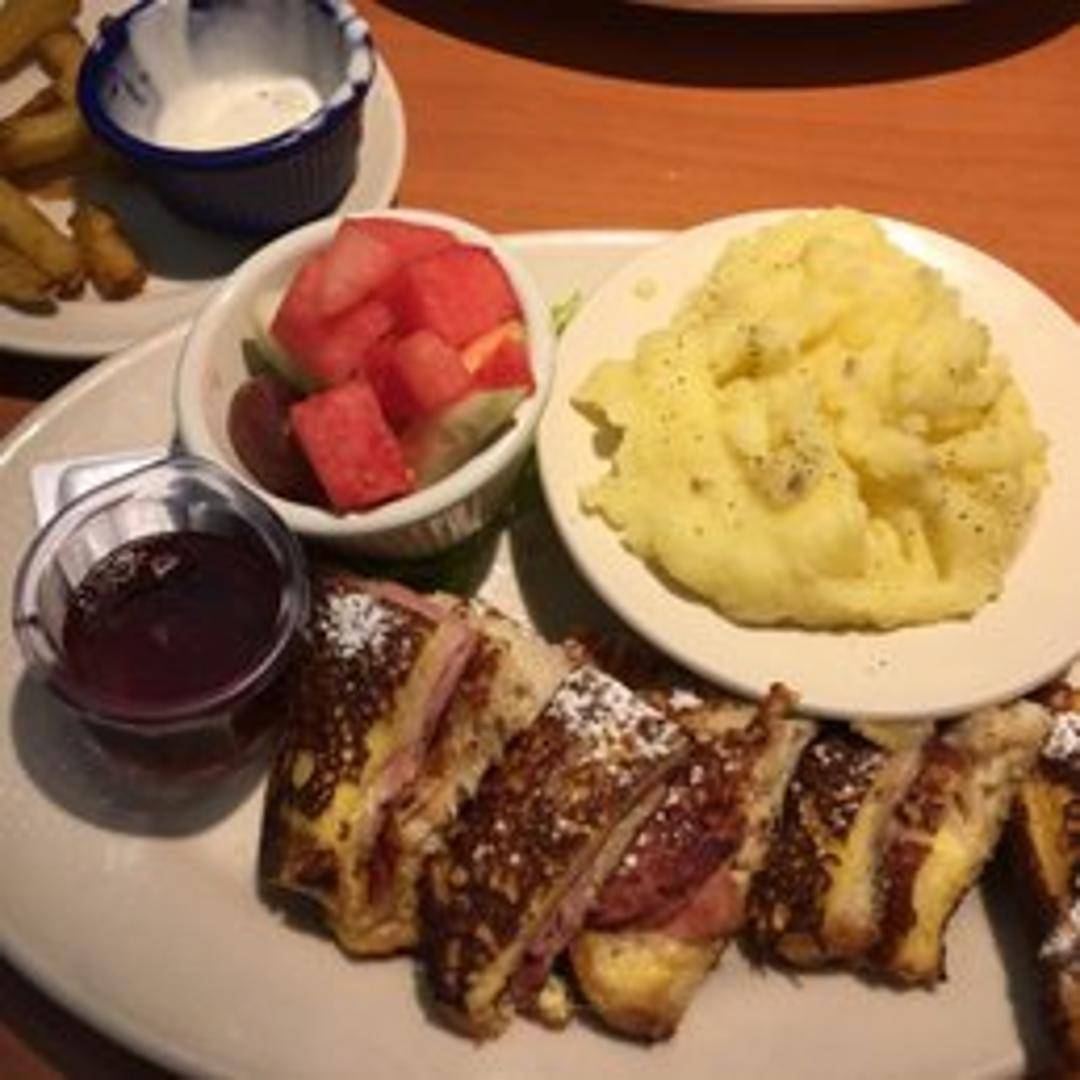 A classic sandwich featuring sliced ham and Swiss cheese layered between slices of egg-dipped and grilled bread. Lightly dusted with powdered sugar and served with a side of fruit preserves.