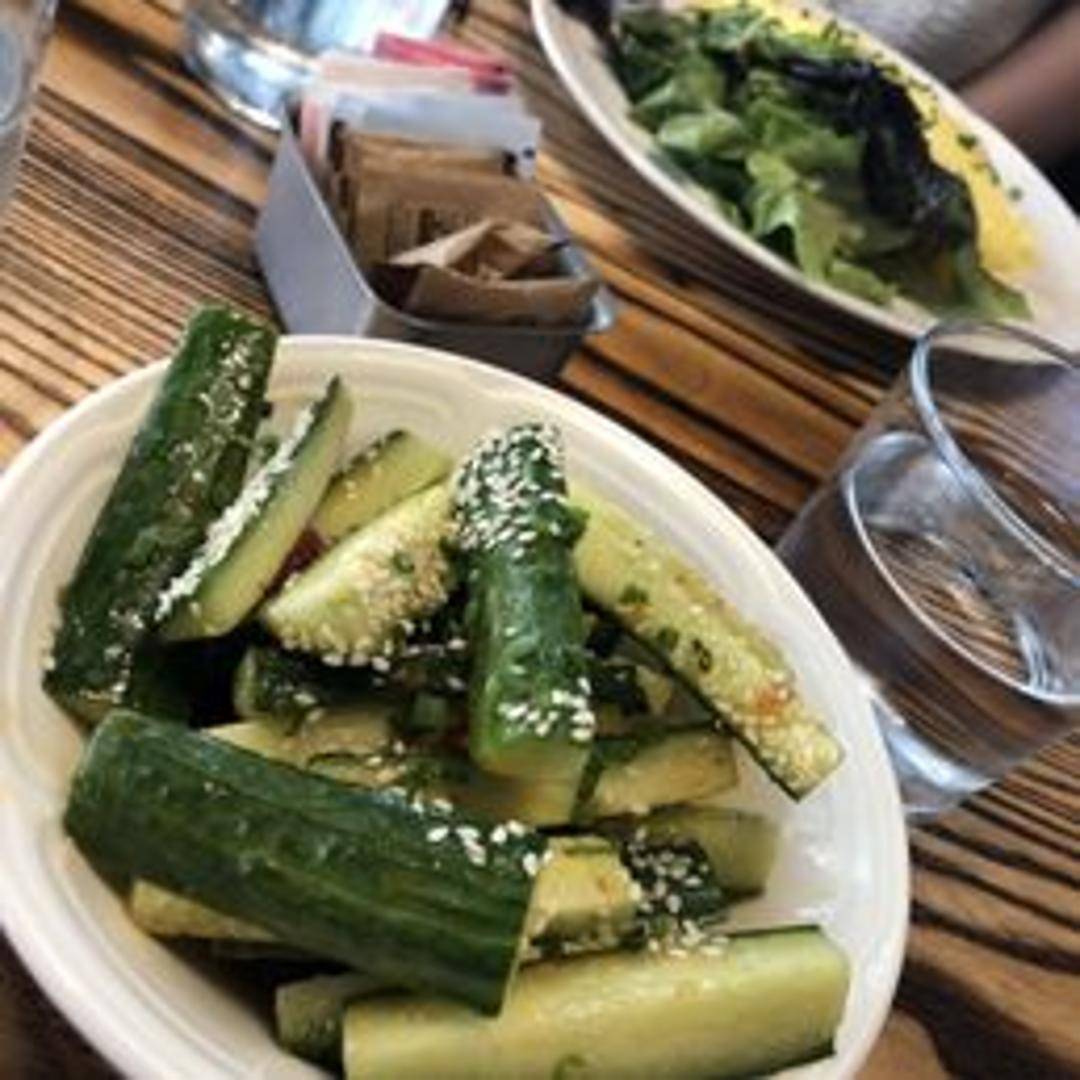 Thinly sliced, crisp cucumbers, marinated in a tangy and refreshing brine, typically featuring vinegar, sugar, water, and aromatic herbs or spices. A perfect light and cool side dish or palate cleanser.