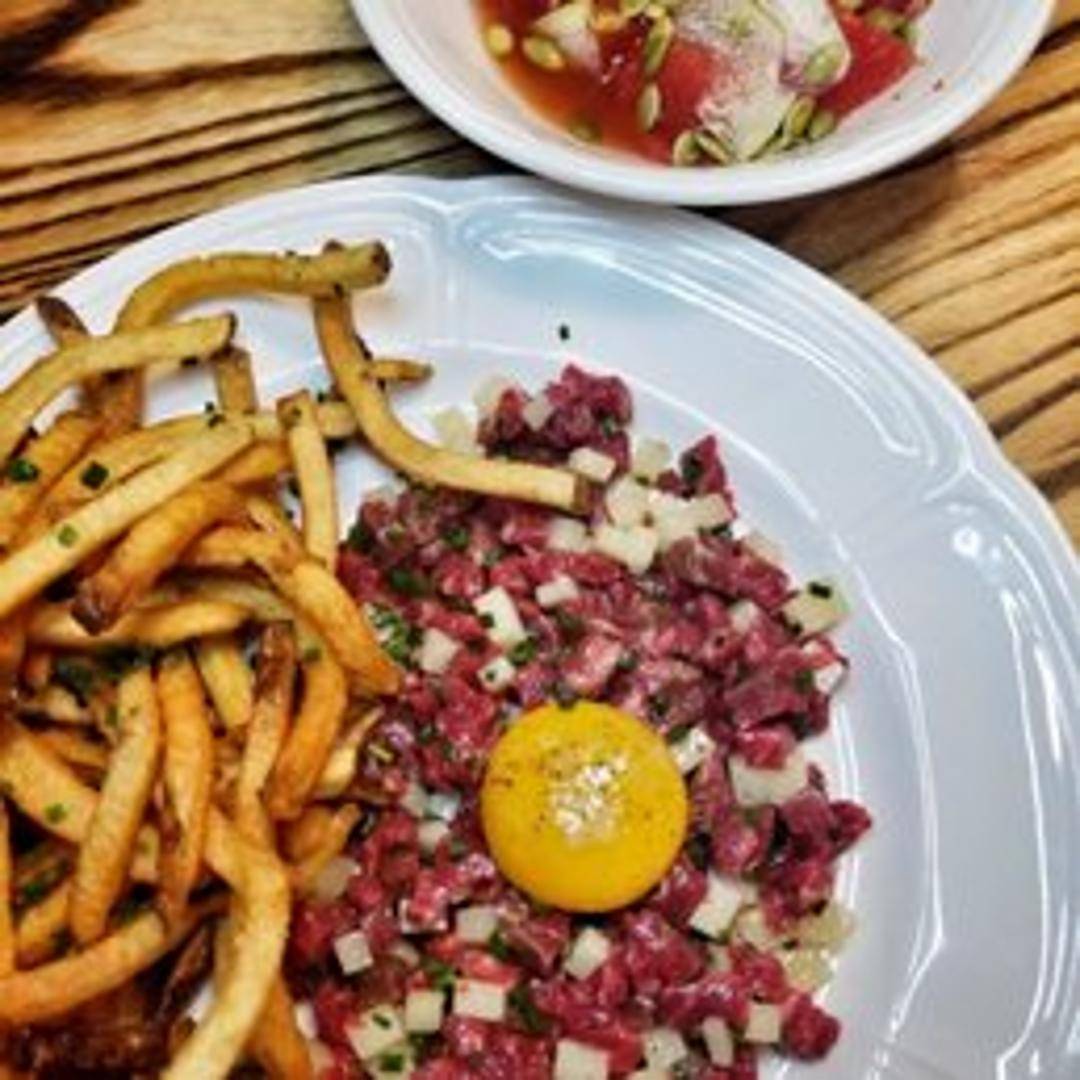 A classic bistro preparation featuring premium raw beef, meticulously hand-chopped and seasoned with capers, shallots, Dijon mustard, and a touch of Worcestershire, crowned with a fresh egg yolk. Served with a side of crisp shoestring fries or toasted baguette slices for a truly refined experience.