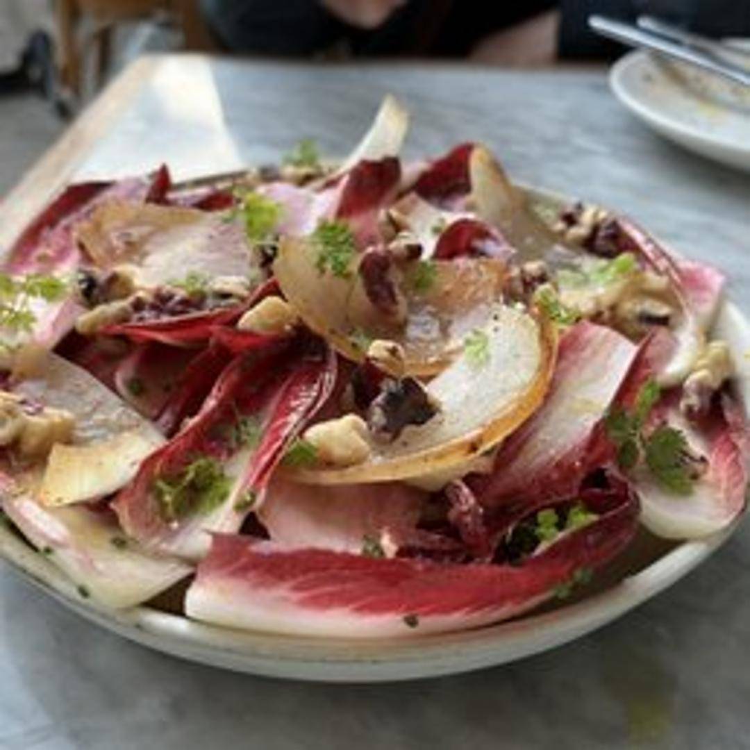A salad featuring grilled onions and endives, offering a mix of sweet, bitter, and smoky flavors. Dressed with a vinaigrette and possibly other fresh herbs.