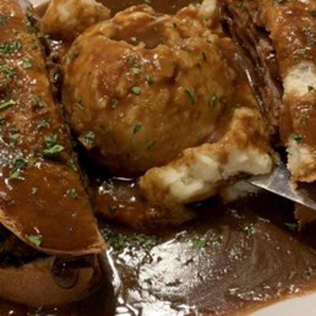 Open-faced sandwich featuring tender, sliced roast beef served atop toasted bread and smothered in rich brown gravy. Served with mashed potatoes.